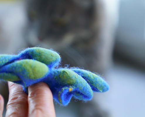 Der Hohlkörper entsteht durch das Umfilzen einer Folie, die später wieder entfernt wird. Aus unserem wollenen Hohlkörper schneiden und formen wir die fantastischsten Schmuckstücke.