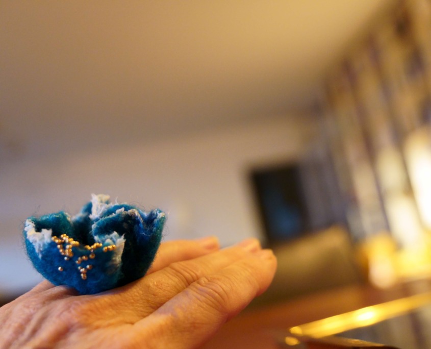Unikatring: Elf Blüten aus Merinowolle auf Silberdraht
