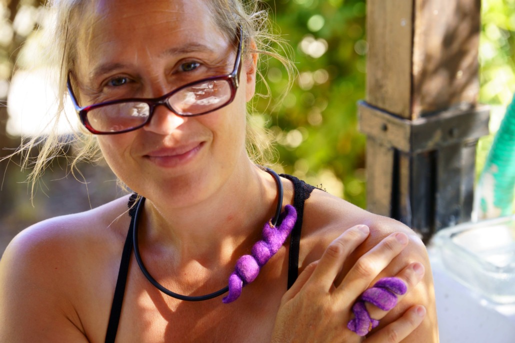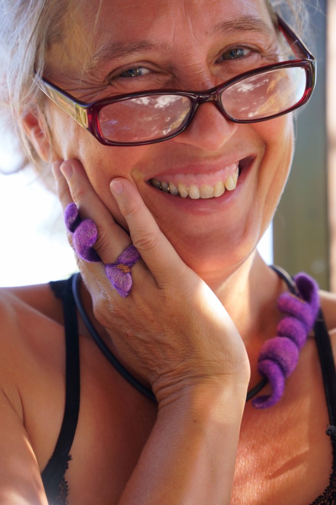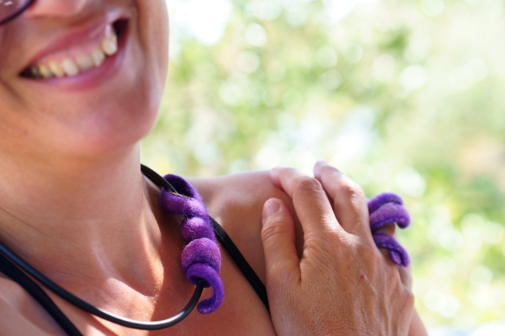 Ring und Halsschmuck sind aus feinster violetter Merinowolle mit Einlege-Elementen und dezenter Bronze-Sickerei. Die mehrdimensionalen Spiralen sind aus der Fläche gearbeitet – sehr spannend!